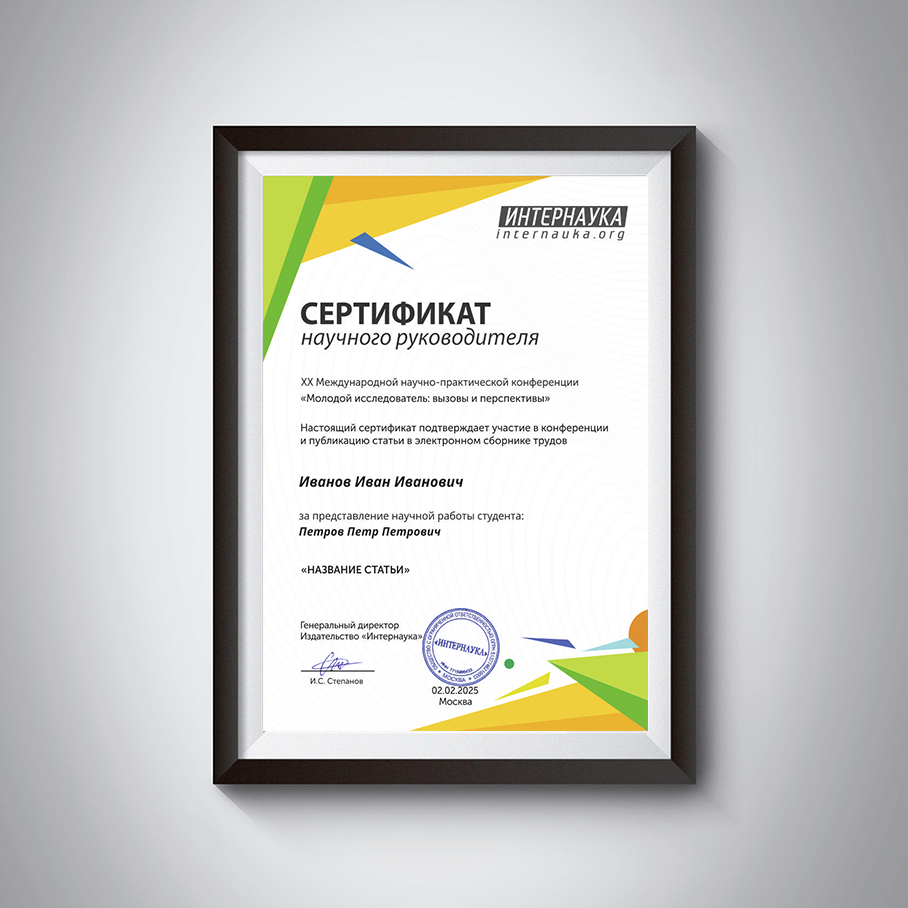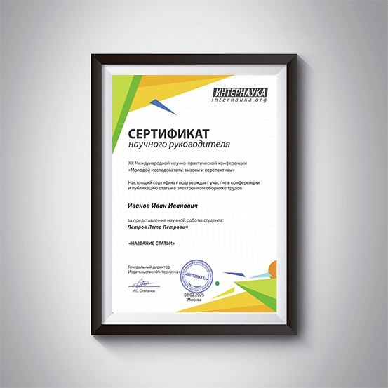 Данный сертификат подтверждает ваше участие в конференции «Молодой исследователь», а так же публикацию статьи в электронном сборнике материалов.